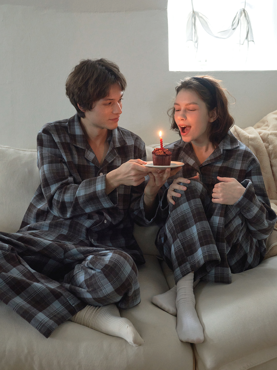 부드럽고 도톰한 터치감이 겨울의 포근함을 전합니다.브라운과 스카이 톤이 어우러진 체크 패턴으로 차분한 겨울 분위기를 완성합니다.